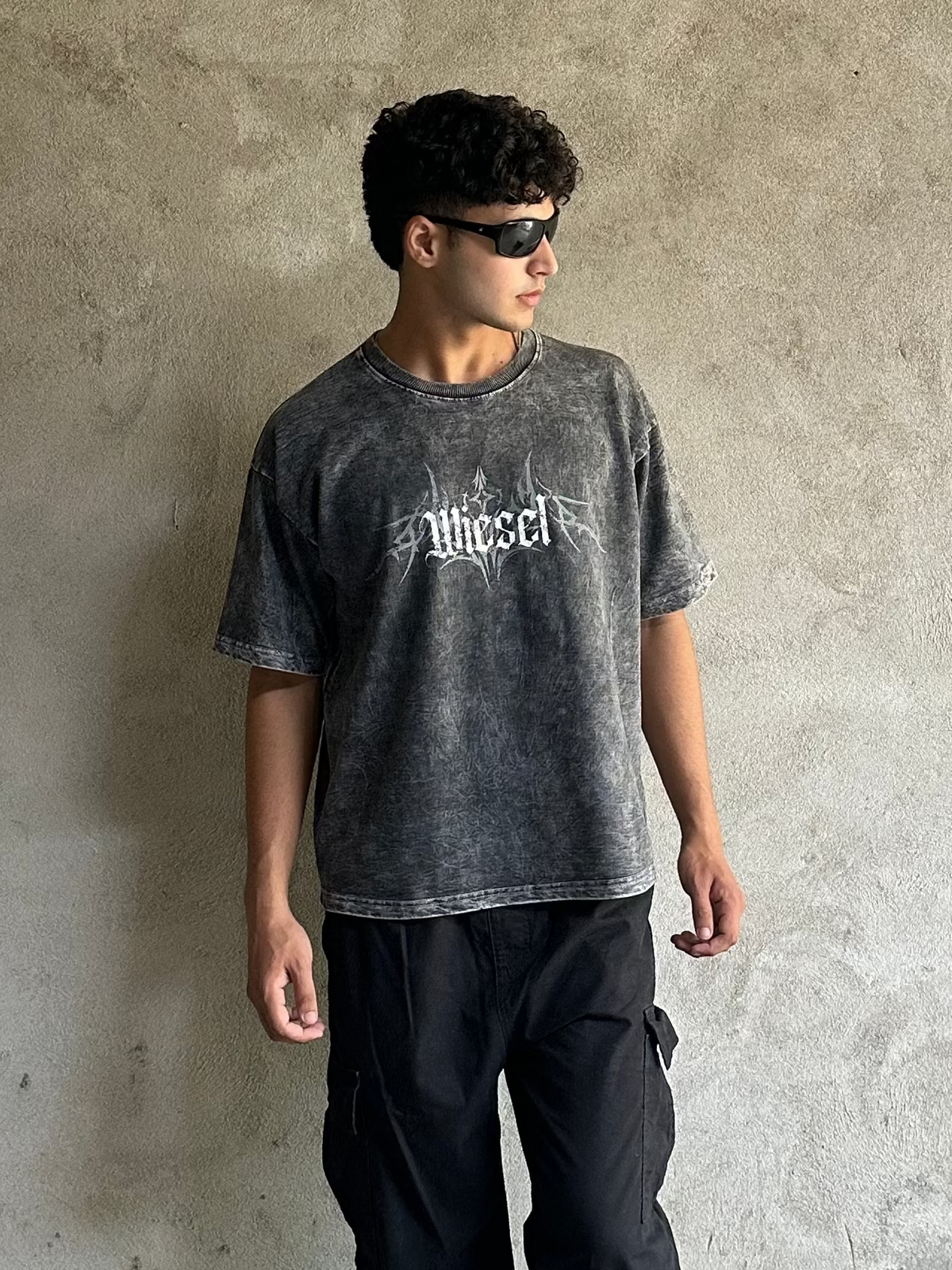 The front keeps it subtle with a gothic Wiesel logo in a distressed print, while the back goes full statement with layered gothic fonts “Echoes of Forgotten, Ravenlore, Wander, Hollow”. The distressed detailing across the design adds character, making every piece feel unique.