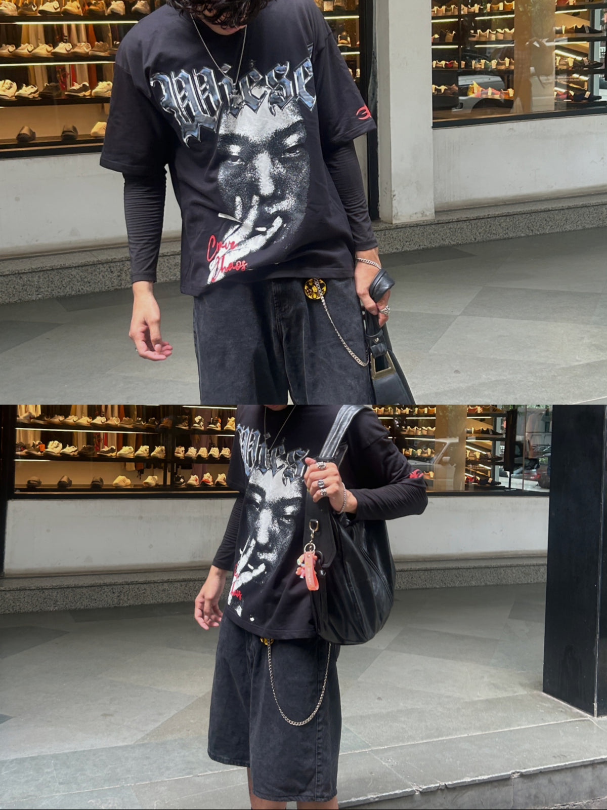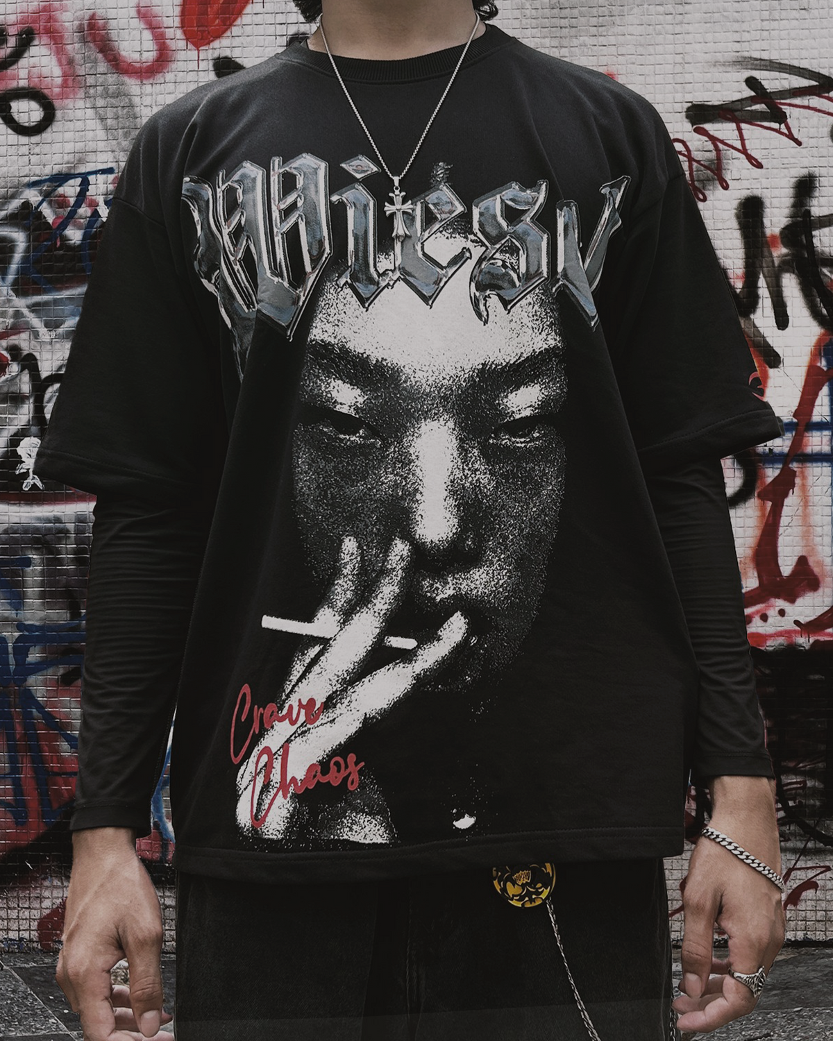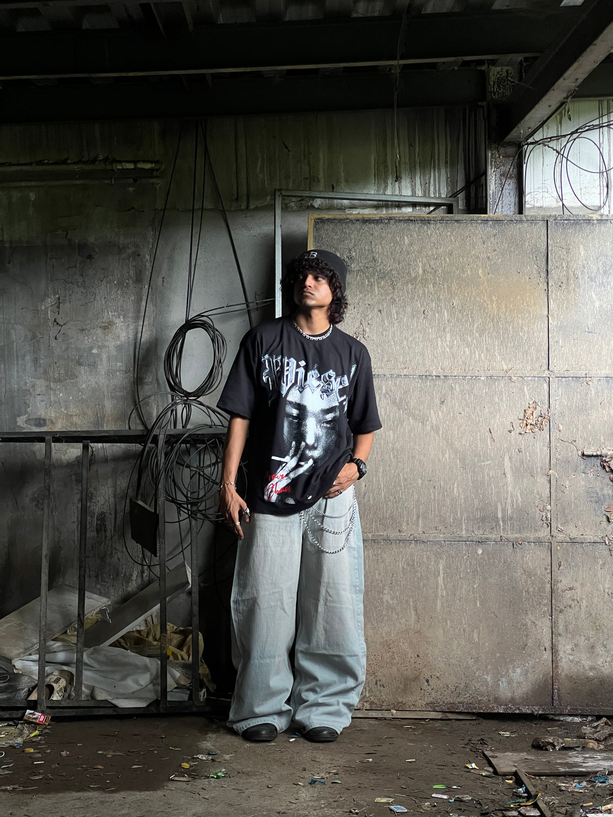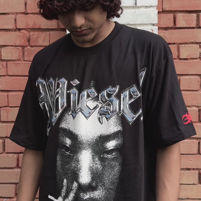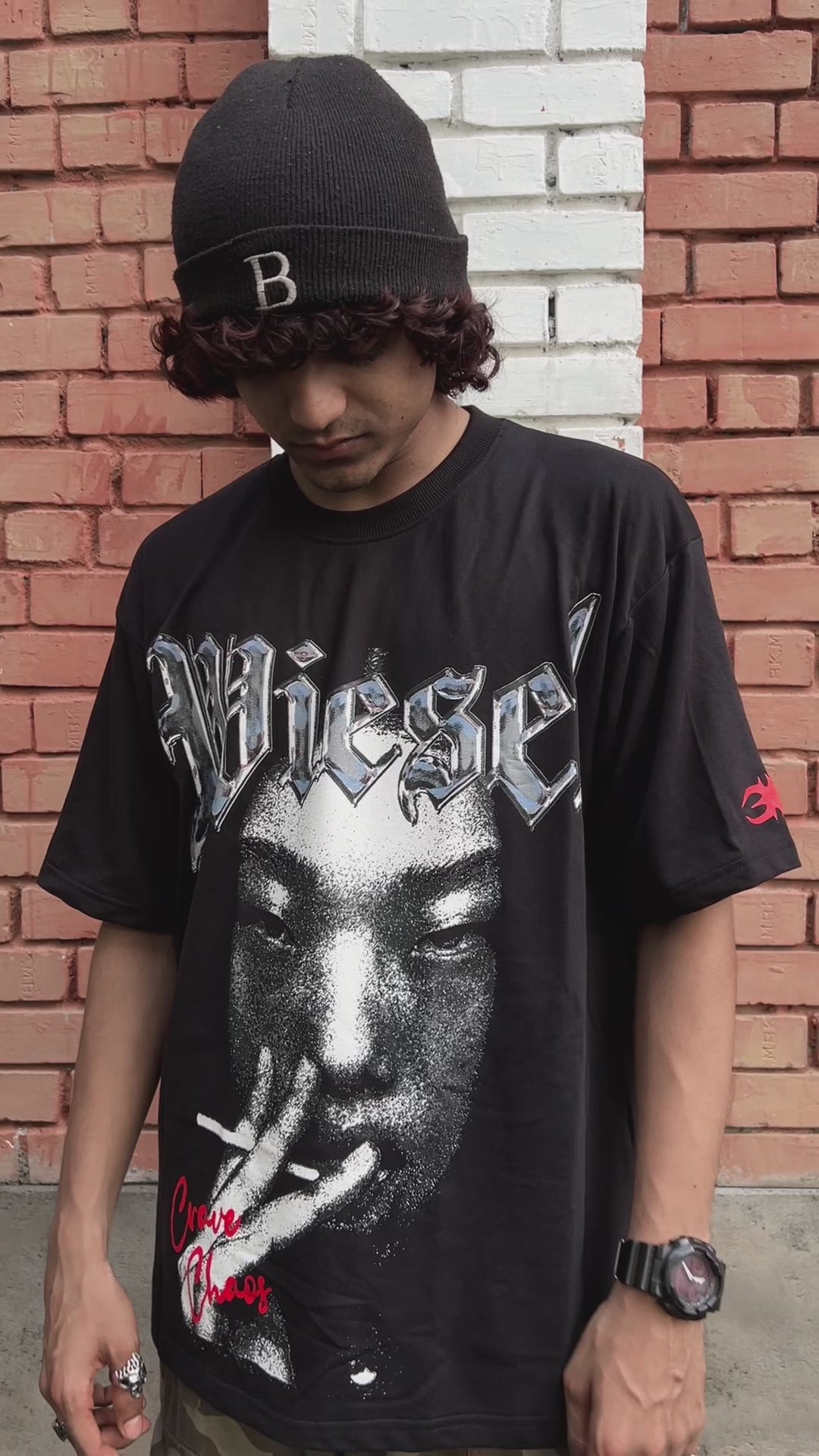 The Crave Chaos Tee is built for those who like their fits unapologetic. Crafted in 260 GSM cotton, this oversized black tee features the gothic Wiesel logo across the chest with distressed detailing, paired with a bold monochrome portrait graphic.